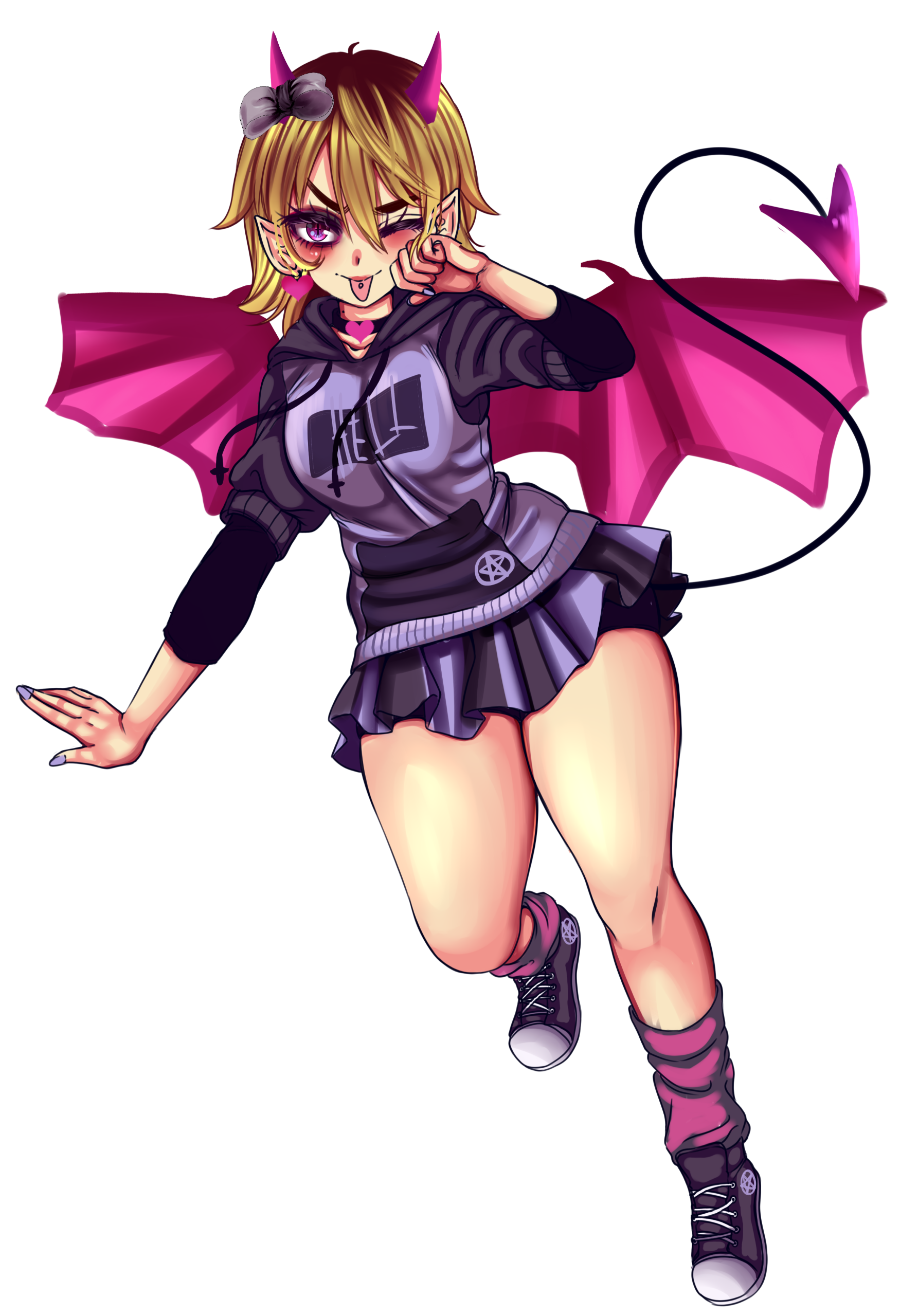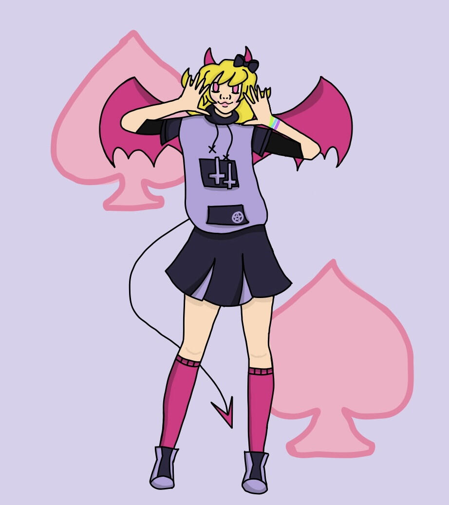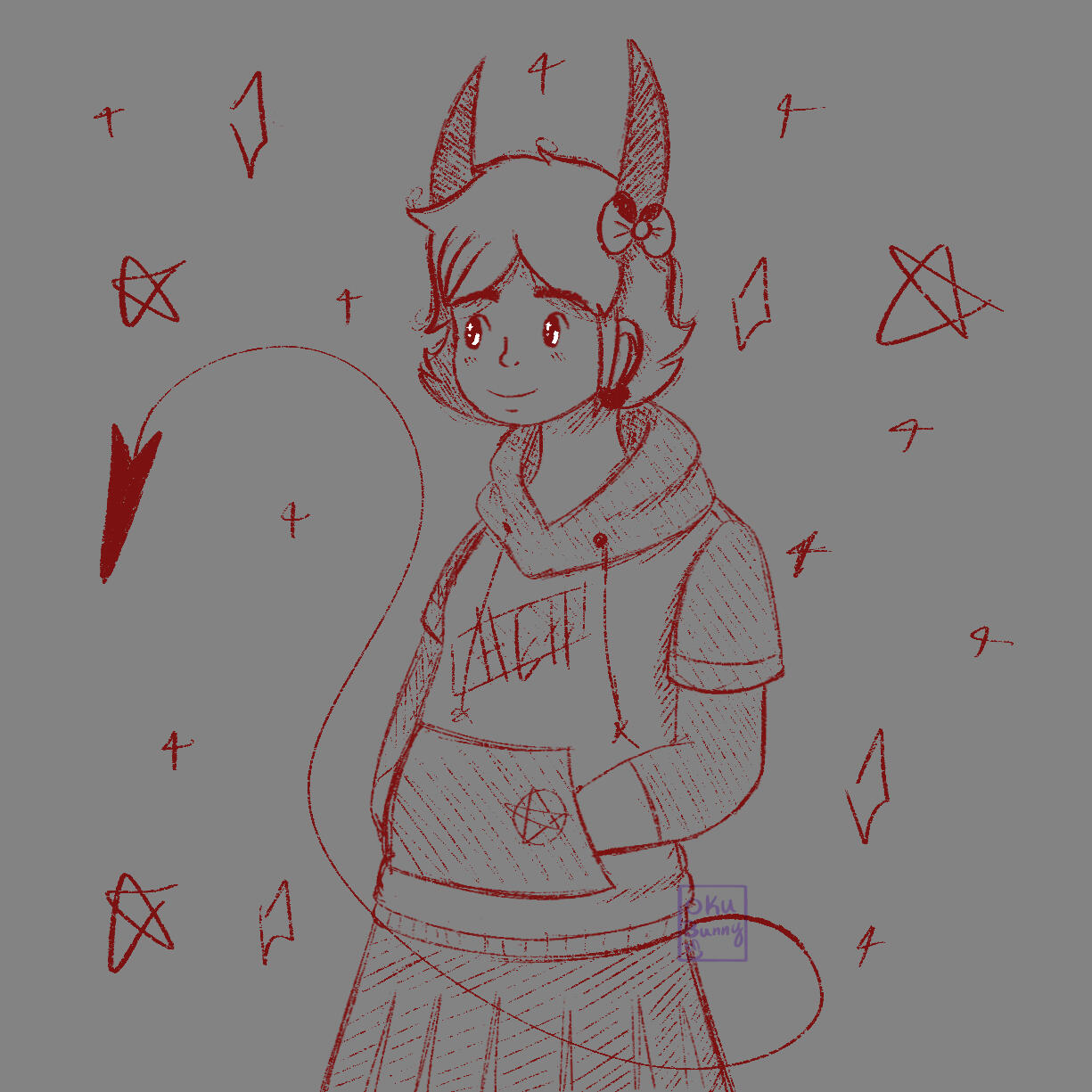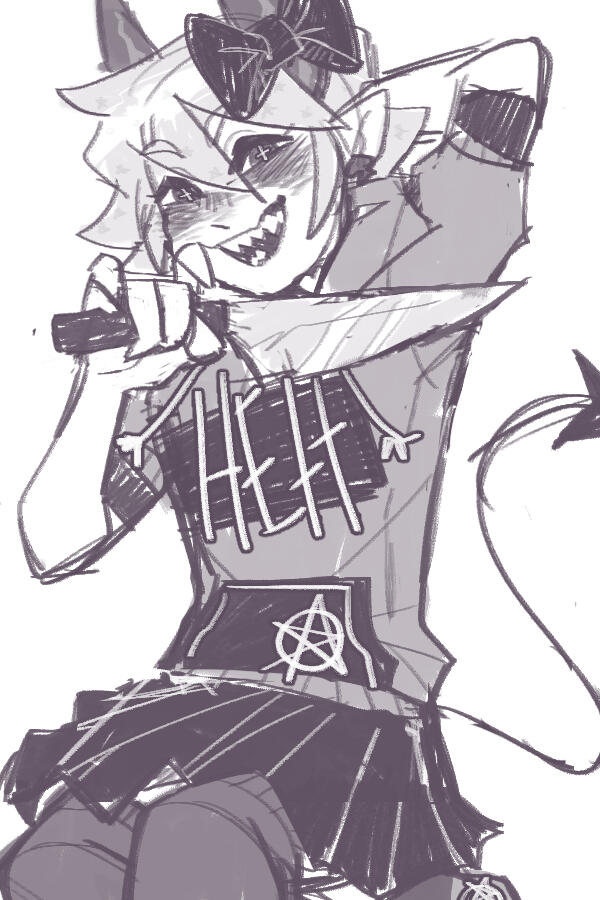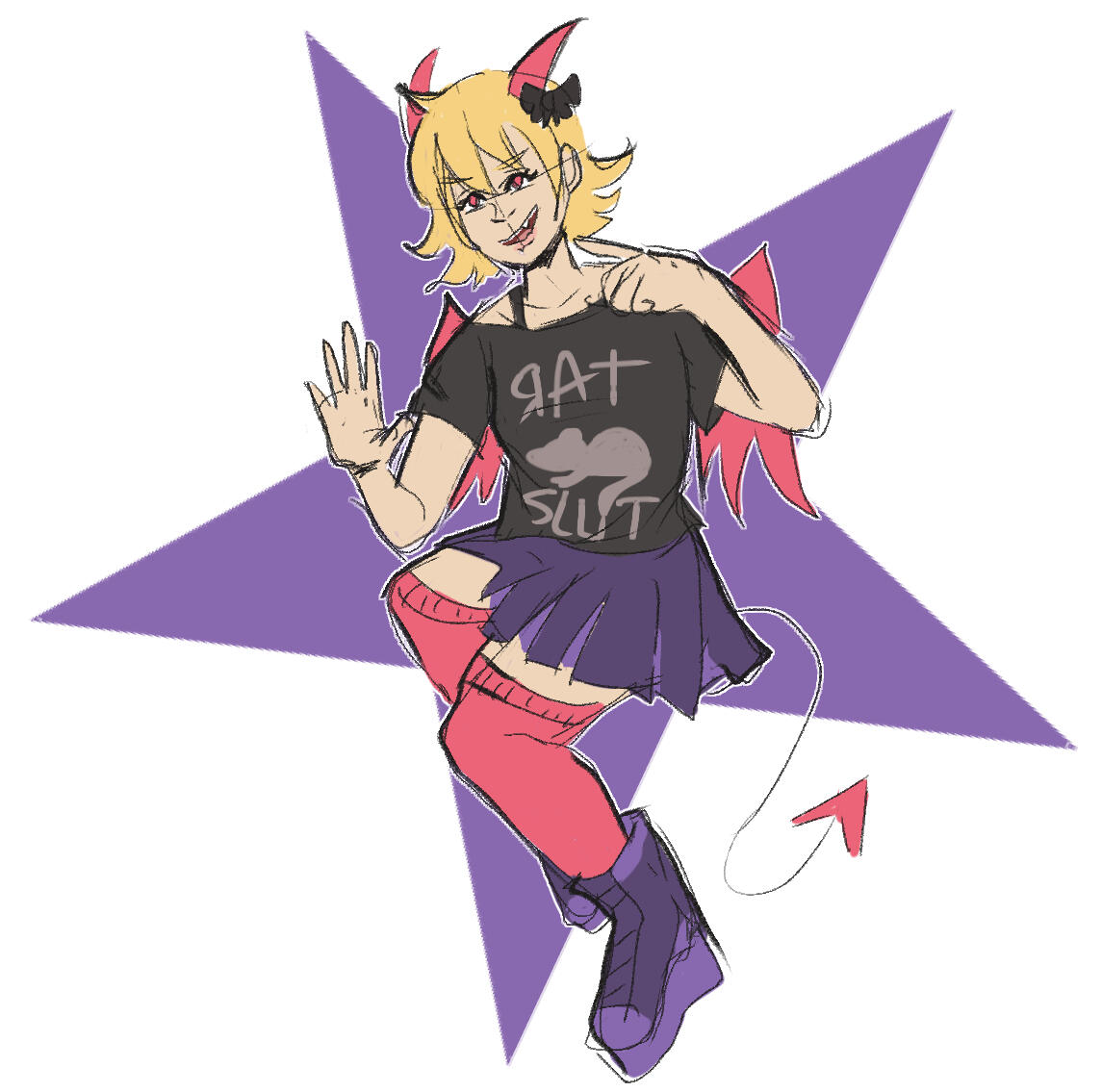 Melanie is a Hell-Born Demon, ie; a demon that didn’t originate from a single corrupted human soul, but born from the energy given off by the many corrupted souls in hell. She tends to find life on the surface more interesting than in Hell since she doesn’t have any important purpose down there and tbh Hell kind of sucks even for demons. Too much bad mojo, Melanie says. She’s pretty chill and prefers to live every day like the homeless equivalent of a couch potato. She likes teasing people and freaking people out but in general, she’s really just pretty mellow. The only thing tying her down to any given location is her dozens of adopted rat children who sleep with her in alleyways.Mel has been living in 'America' since about 1750. She’s never met Satan, but she refers to him as “Dad”/"Daddy" either way, probably just to rub it in. She’s really into fashion, shoplifting, and cool memes. Most nights are spent in an alley with a trashcan fire, canned food, and rats. She loves her rats.She’ll flirt with boys to get things she wants out of them, but generally will not form romantic attachments to them. She loves kissing women.